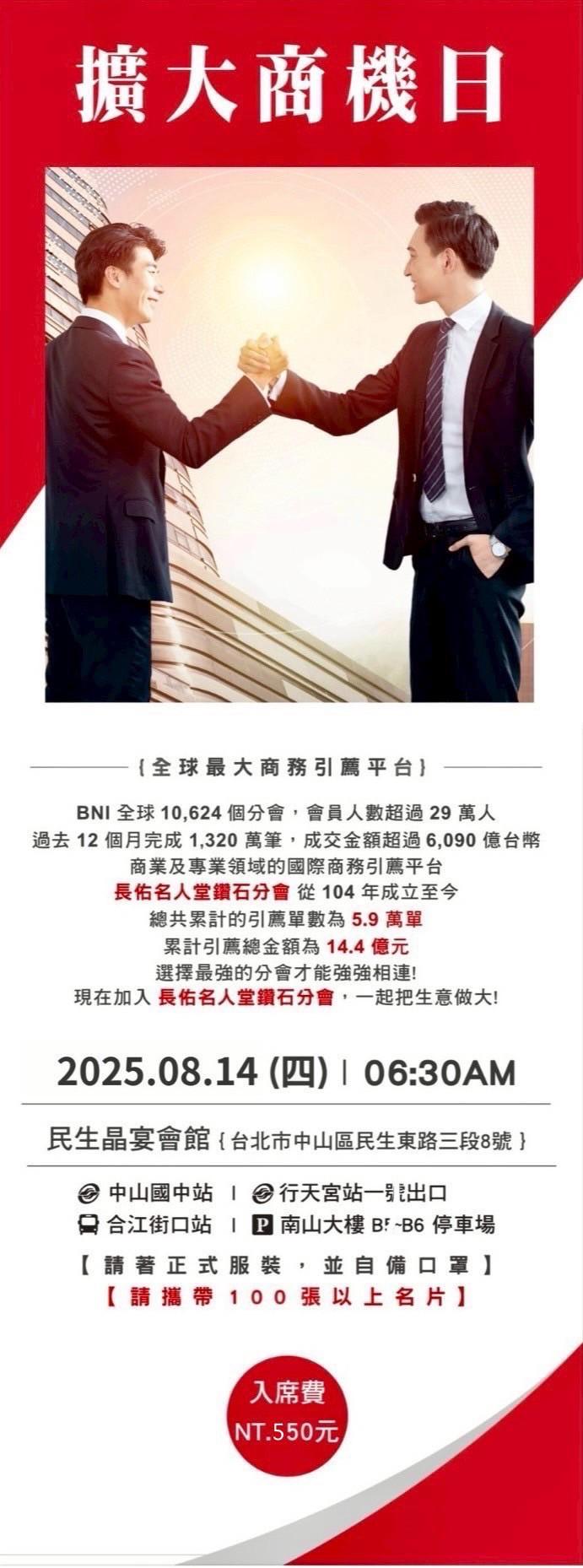 BNI創業家活動紀錄展現了我們會員之間的緊密連結與互助精神。在這裡,您可以見證每一次會議、交流與合作的精彩瞬間。從專業演講到業務互推,每一張照片都記錄了我們共同成長的軌跡。歡迎瀏覽我們的精選相簿,一同感受BNI創業家活動帶來的無限可能與動力。